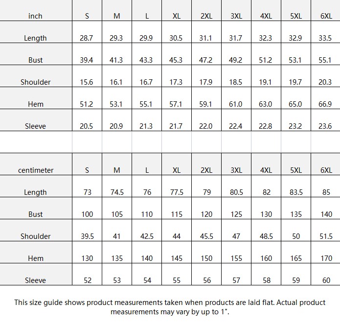 | centimeter | S | M | L | XL | 2XL | 3XL | 4XL | 5XL | 6XL |